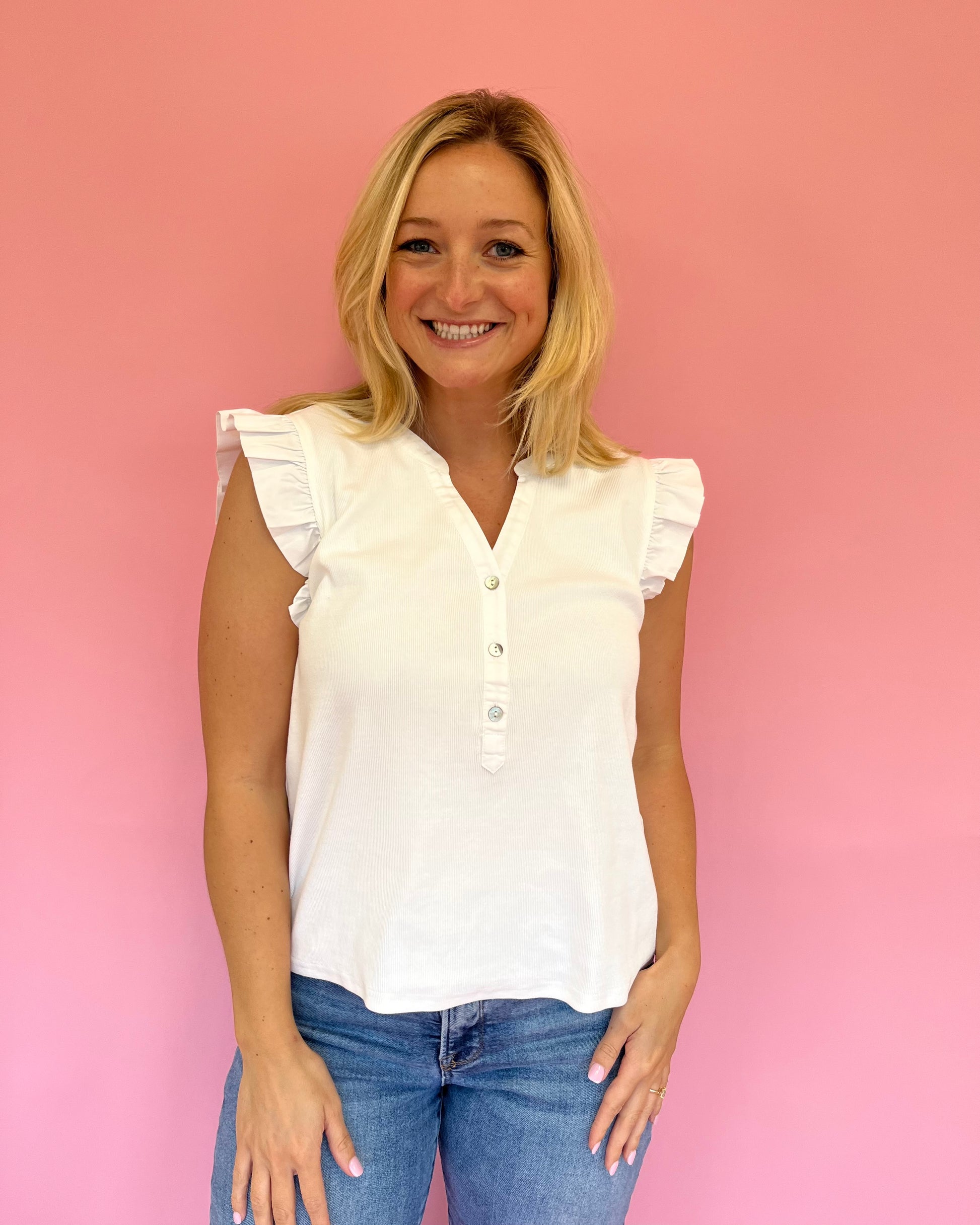 The Amelia White Ribbed Top is a timeless essential with a feminine twist! Made from soft white ribbed fabric, this top features flutter sleeves, a flattering v-neckline, and delicate button detailing. Perfect on its own or layered under jackets and cardigans, it’s an easy piece to dress up or down all year long.