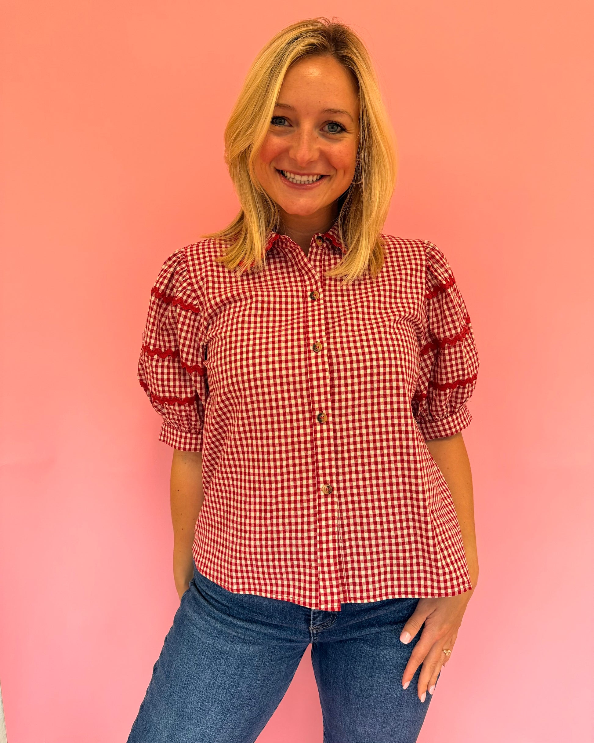 The Amy Red Gingham Top is cheerful and full of charm! Featuring a white and red gingham pattern, this top includes a button-up front, puff sleeves with playful ric rac trim, and a classic collar. It’s the perfect mix of timeless style and fun for sunny, warm-weather days!