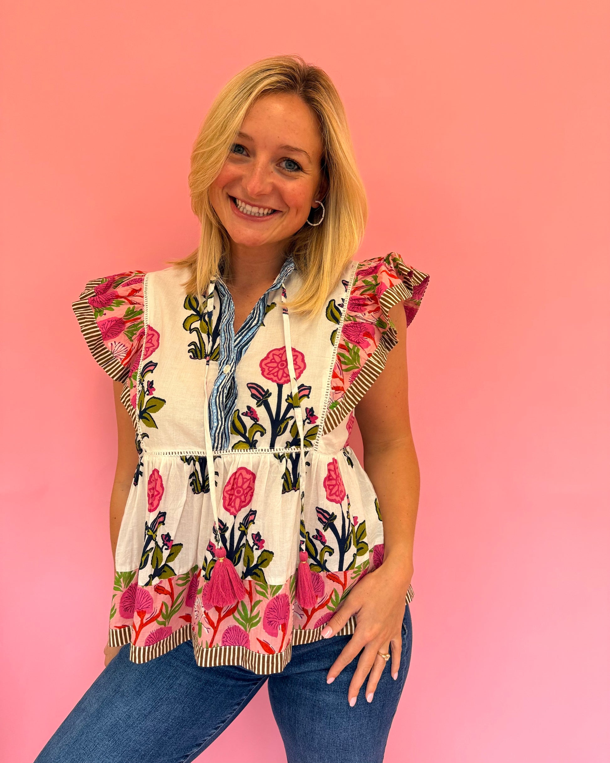 The Annabelle Floral Top is the perfect piece to ease into fall! Featuring a charming patchwork floral pattern in warm browns, soft pinks, whites, and blues, this top is designed with flutter sleeves for a feminine touch. Fun, flattering, and easy to style — a must-have for the season!