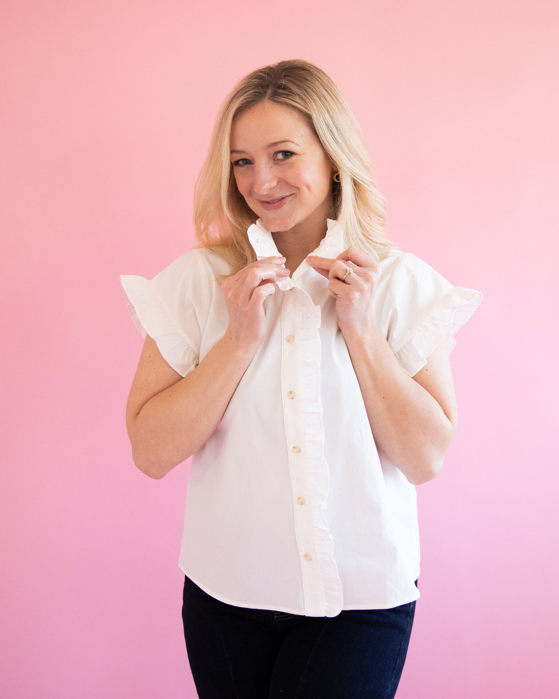 Say "hello" to an everyday go-to top that you'll reach for over and over again! The Bri Pink Ruffle Top features a ruffle at the neckline, hem and down the front as well as a fully button front, short sleeve, and the perfect length.