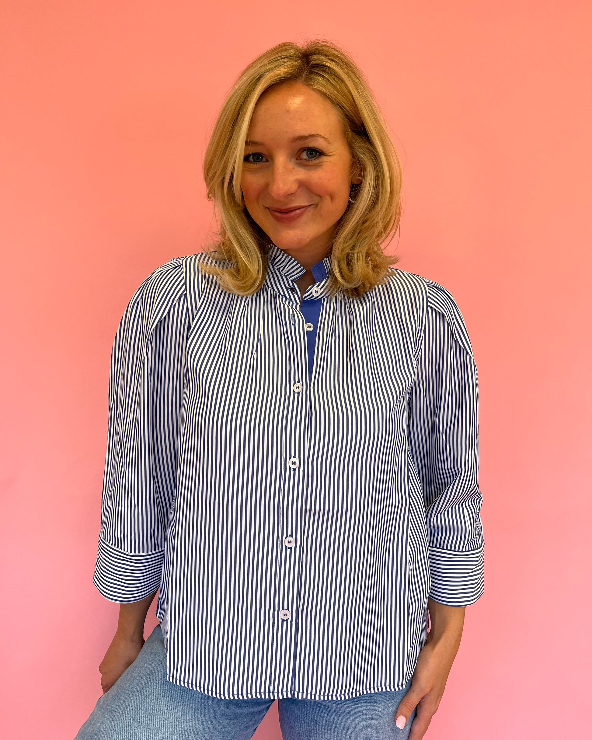 The Bridget Blue Stripe 3/4 Sleeve Top is timeless, chic, and full of charming details. Featuring crisp blue and white stripes, this top includes a delicate ruffle at the neckline, button-up front, and flattering 3/4 length sleeves. Its lightweight feel and tailored look make it perfect for workdays or weekends — an easy wardrobe staple you’ll wear year-round.