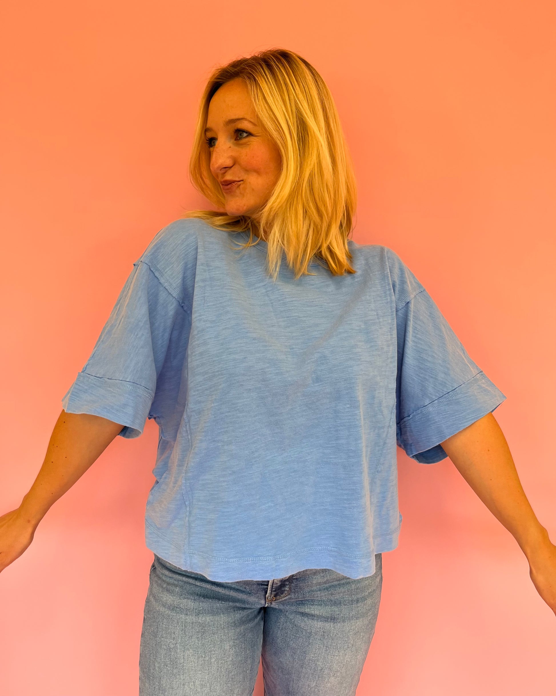 The Jackie Blue Flowy Tee is a must-have staple with an elevated feel. Crafted in the perfect shade of blue, this tee features a relaxed, flowy fit with flattering half sleeves that make it ideal for year-round wear. Easy to dress up with trousers or keep casual with denim — it’s the kind of tee you’ll reach for again and again.