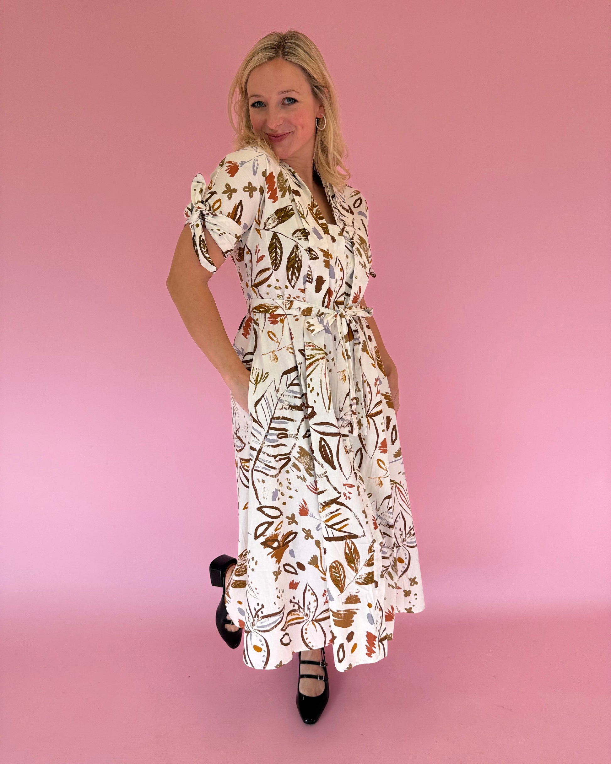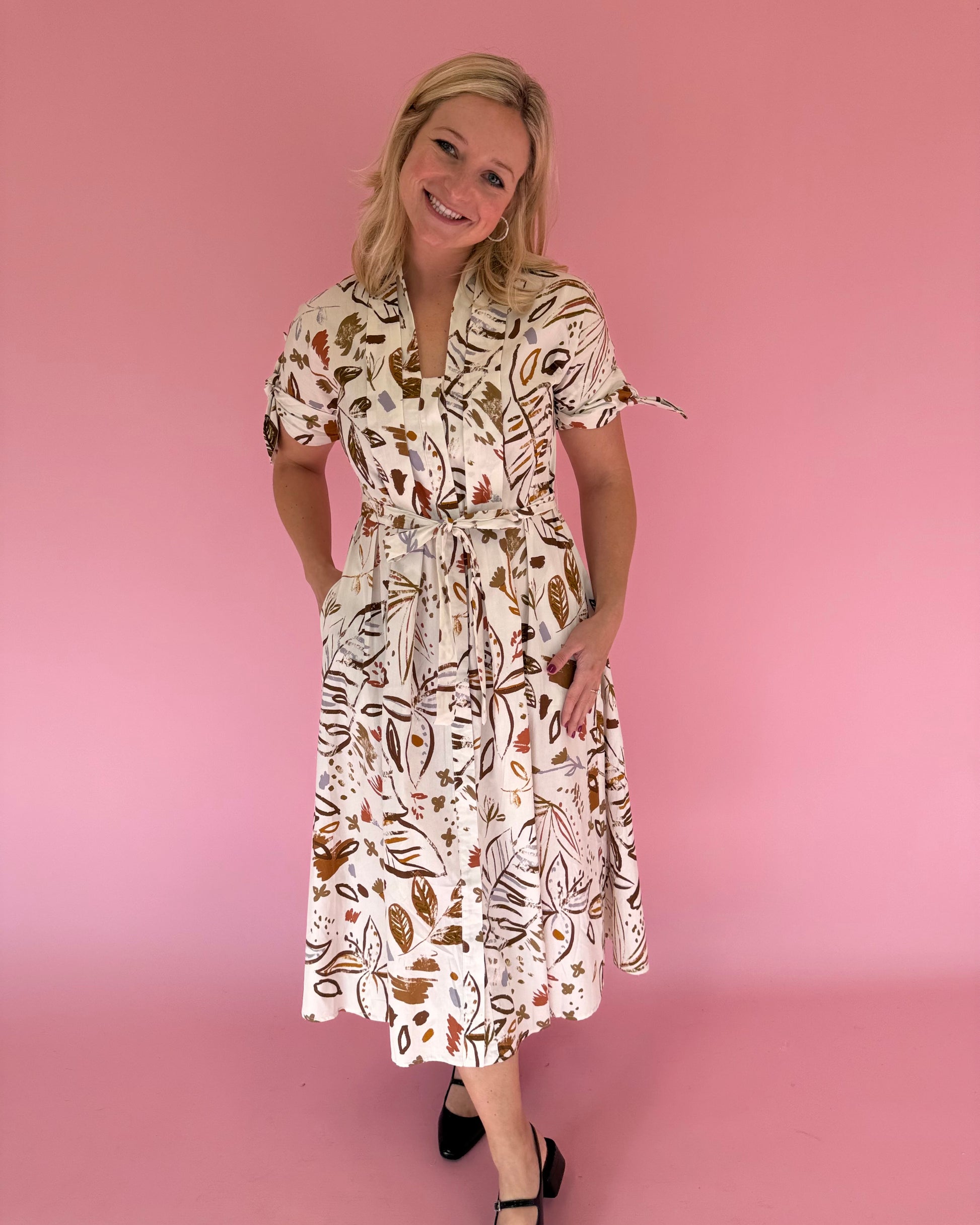 The Jenny Olive Floral Print Dress is where timeless charm meets effortless style. Featuring an off-white base with soft, neutral floral patterns, this collared midi dress has a pleated front, button details, and a flattering tie waistline. With short sleeves and a flowy fit, it’s perfect for brunch, workdays, or weekend outings — classic Tailored Goose elegance with a modern twist.