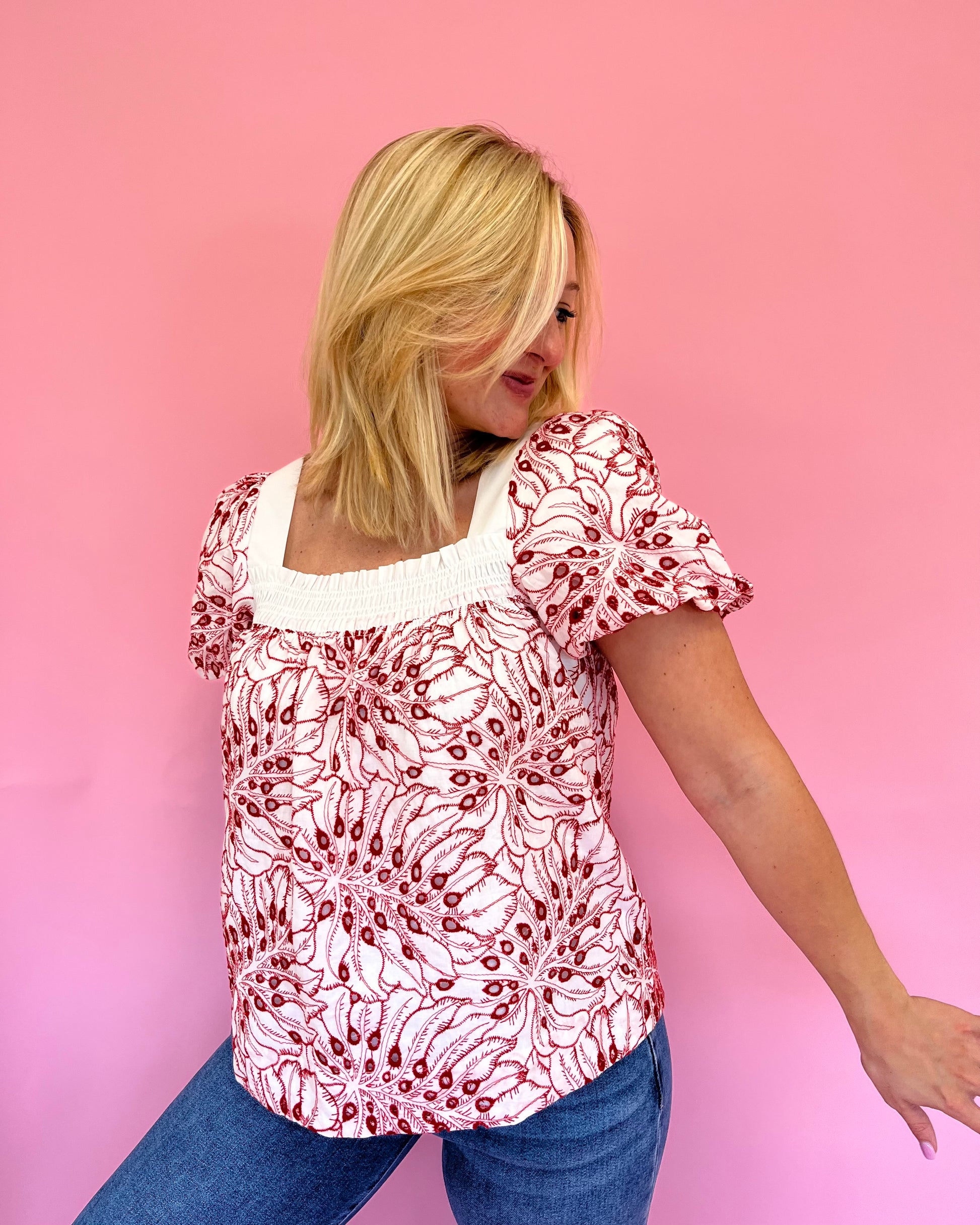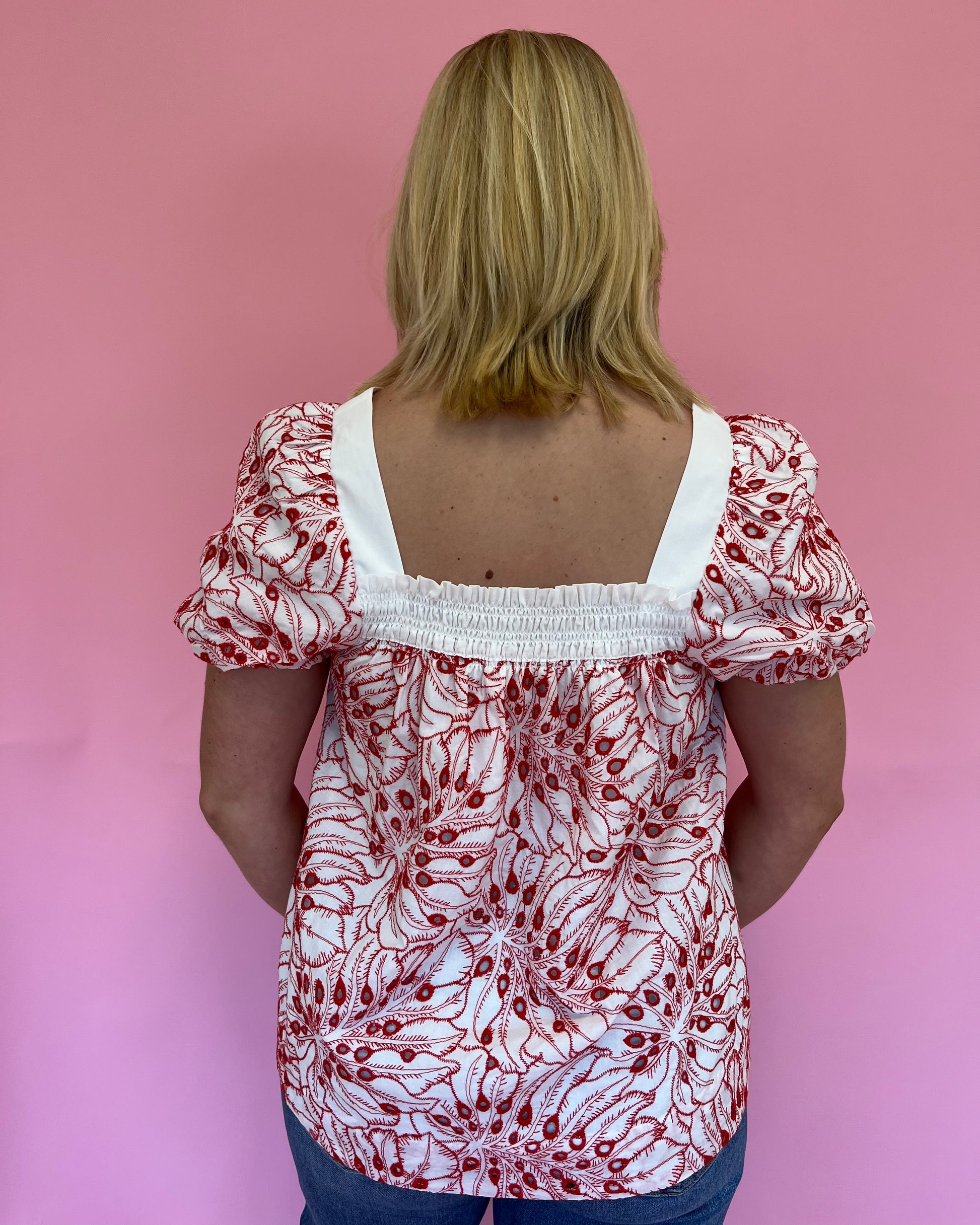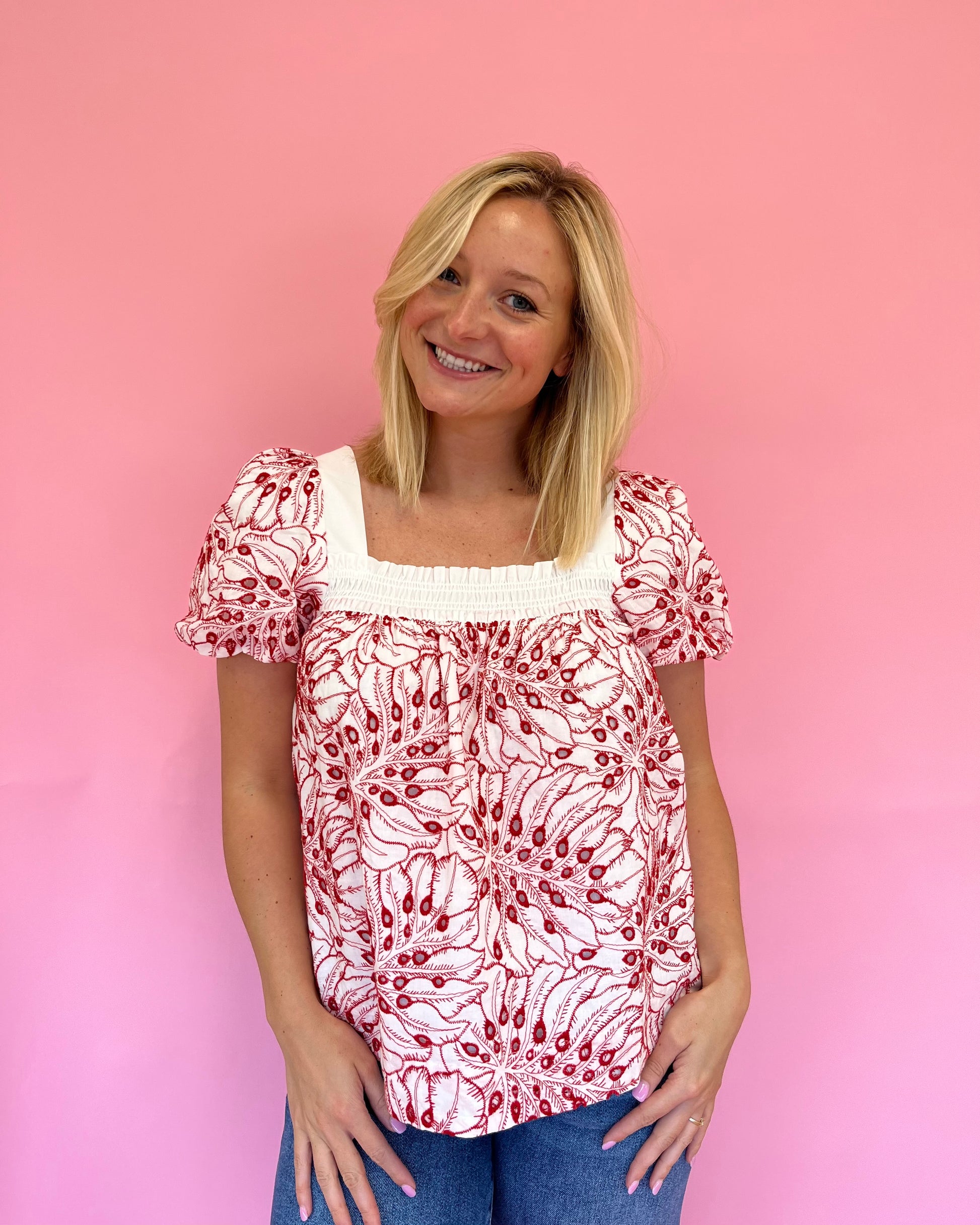 The Jessica Red Eyelet Top is the perfect blend of bold and feminine! Featuring a white base with red eyelet in a floral-like pattern, this blousy top has a flattering square neckline and slight puff sleeves. Breezy and beautiful, it’s an easy statement piece for warm, sunny days.