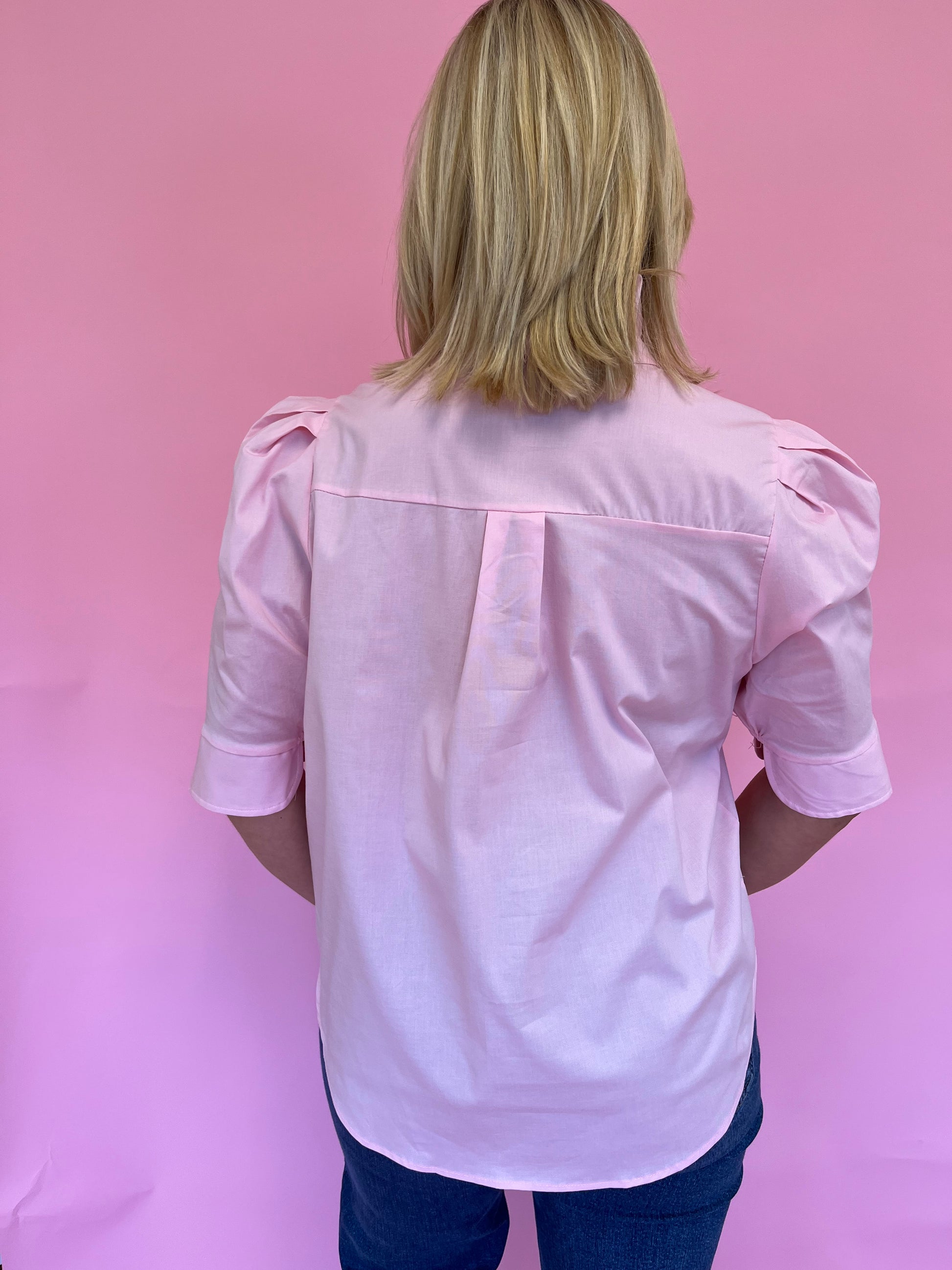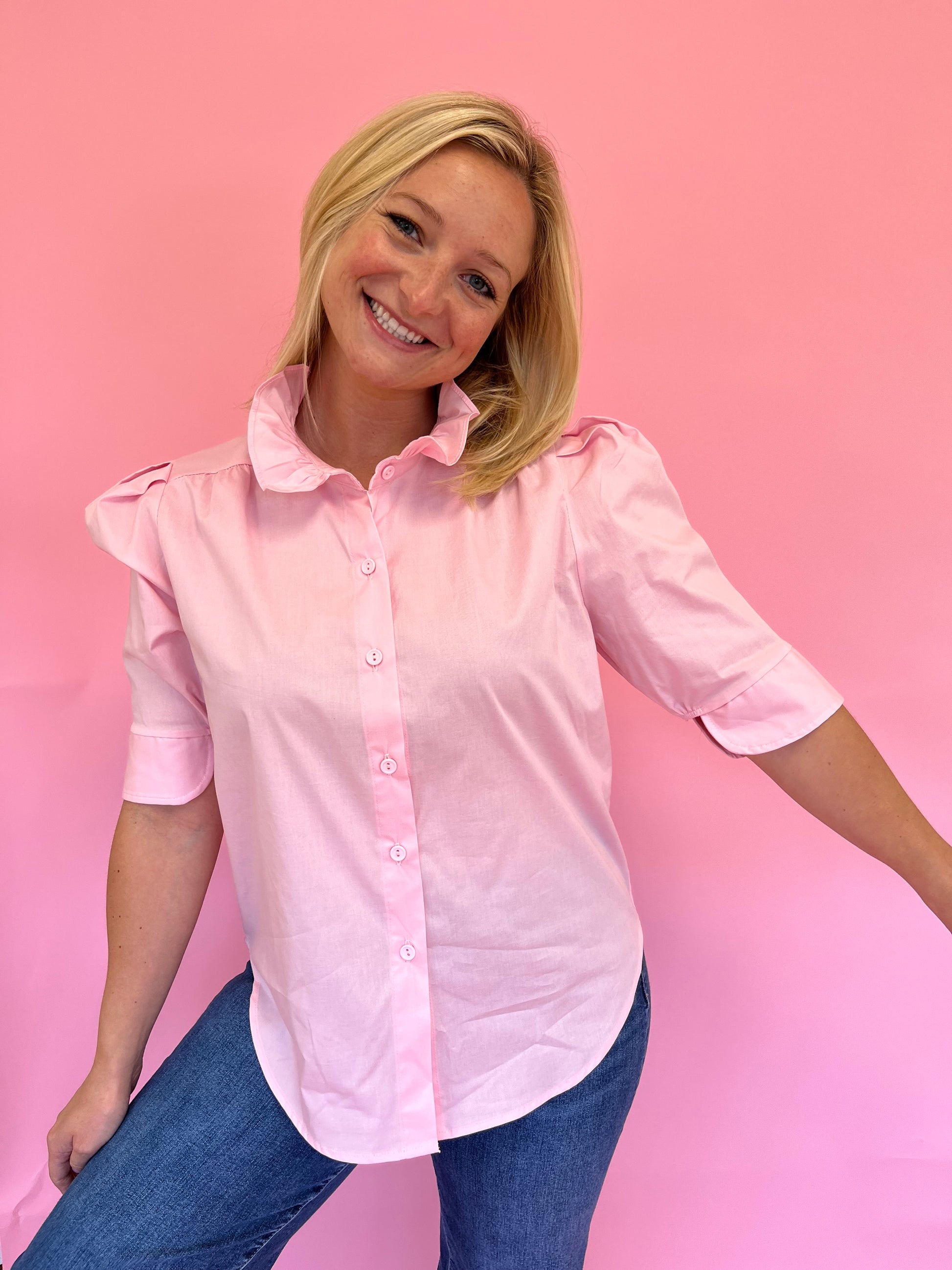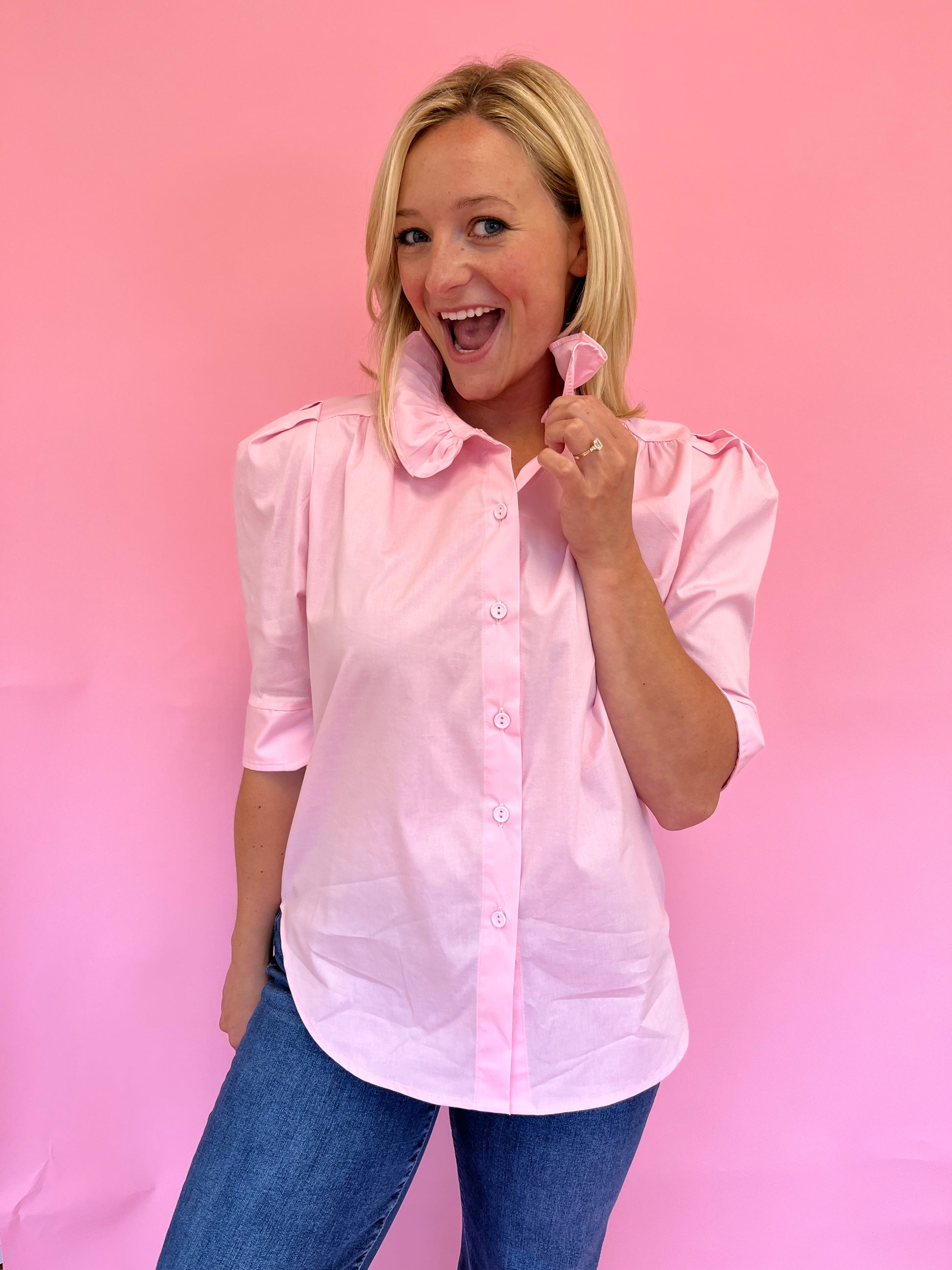 The Jodie Pink Ruffle Collar Top is effortlessly chic and feminine! Made from soft pink cotton, it features a button front, slight puff sleeves, and a delicate ruffle neckline. Perfect for dressing up or down, this stylish top adds a polished pop of color to your warm-weather wardrobe.