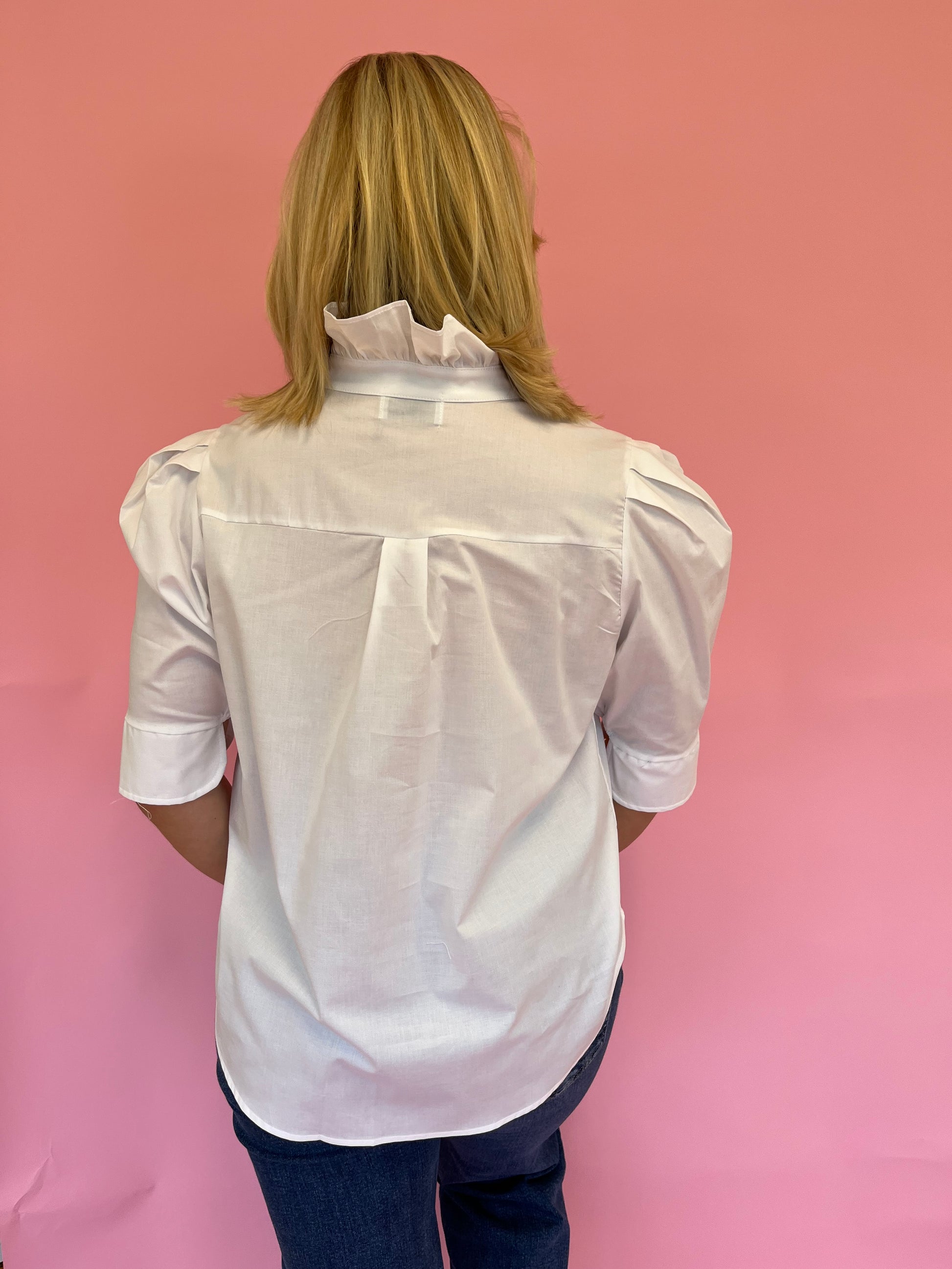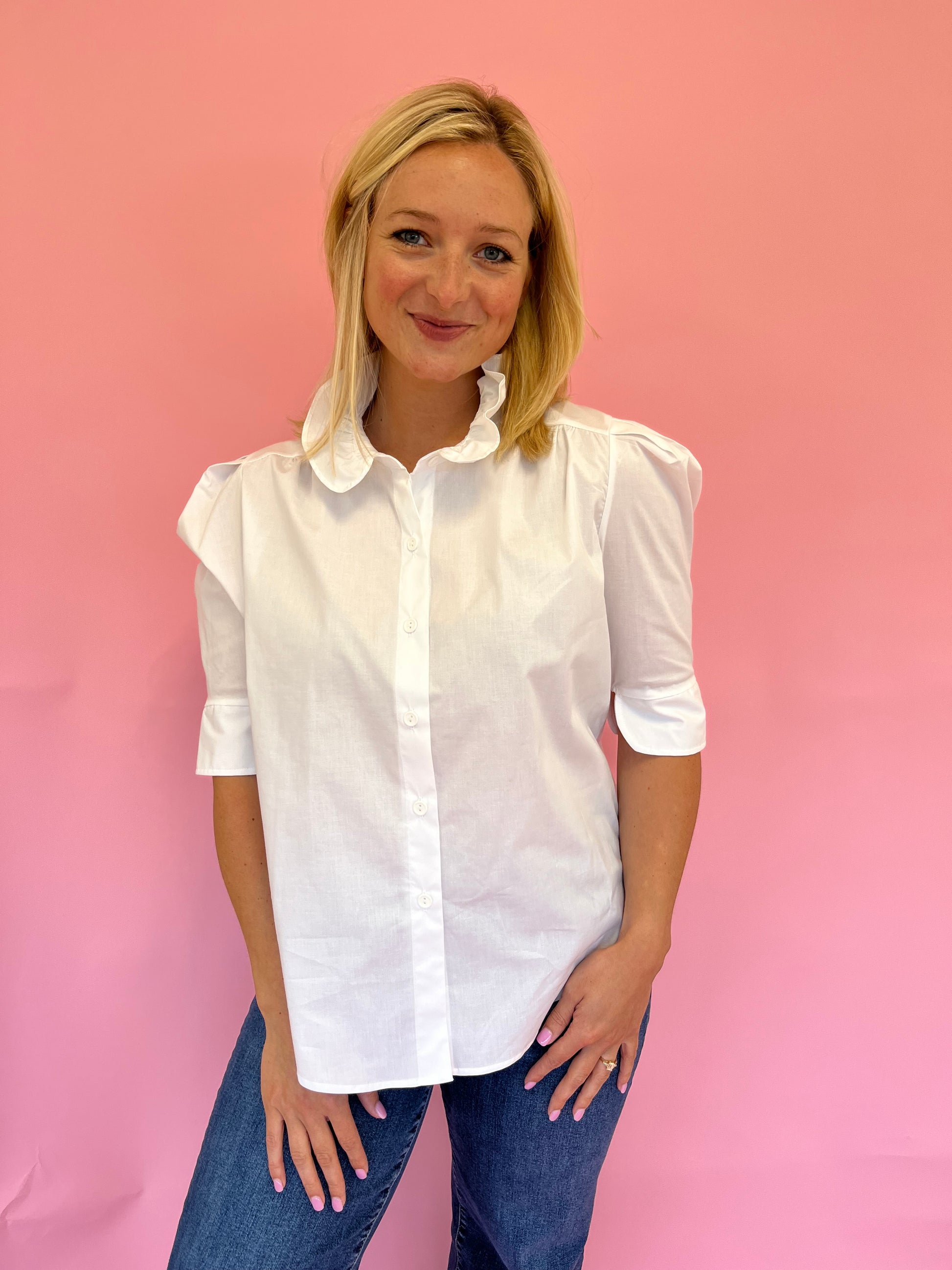 The Jodie White Ruffle Collar Top is effortlessly chic and timeless! Made from crisp white cotton, it features a button front, slight puff sleeves, and a feminine ruffle neckline. Perfect for dressing up or keeping it casual, this top adds a polished touch to any warm-weather look.