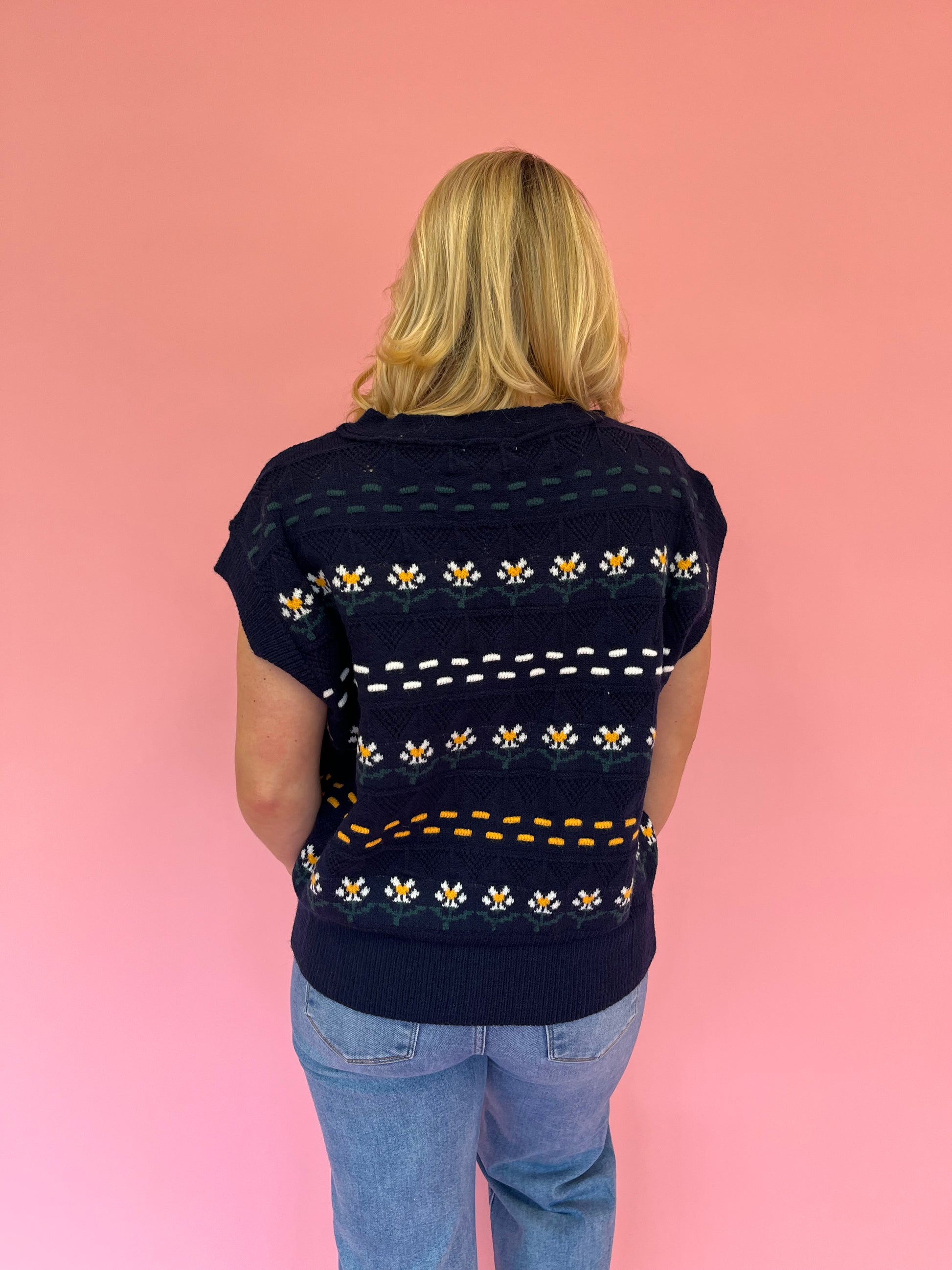 The Kendra Navy Knit Sweater Vest adds a charming twist to any outfit! This soft, cozy knit features daisy floral motifs and stripe accents on a classic navy body. Designed with a flattering v‑neckline, sleeveless silhouette, and button‑down front, it layers effortlessly over blouses or tees. A versatile staple that brings fresh style to every season!