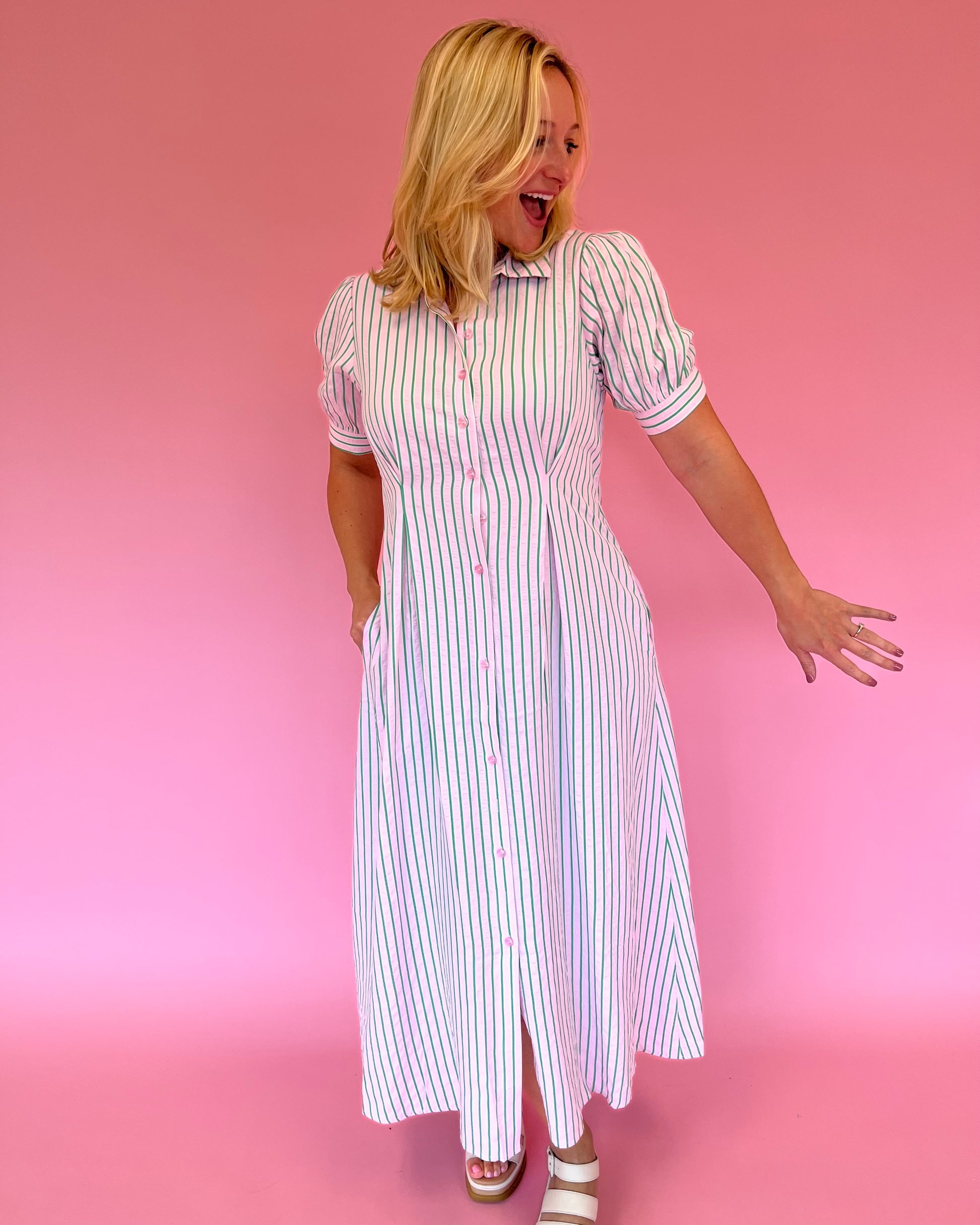 The Lola Pink and Green Stripe Dress is a colorful classic with standout style. Featuring bold pink with green vertical stripes, this maxi dress includes a collared neckline, button front, and slight puff half sleeves. It gathers at the waist for a flattering silhouette, while side pockets add everyday functionality. Perfect for dressing up or down in any season.