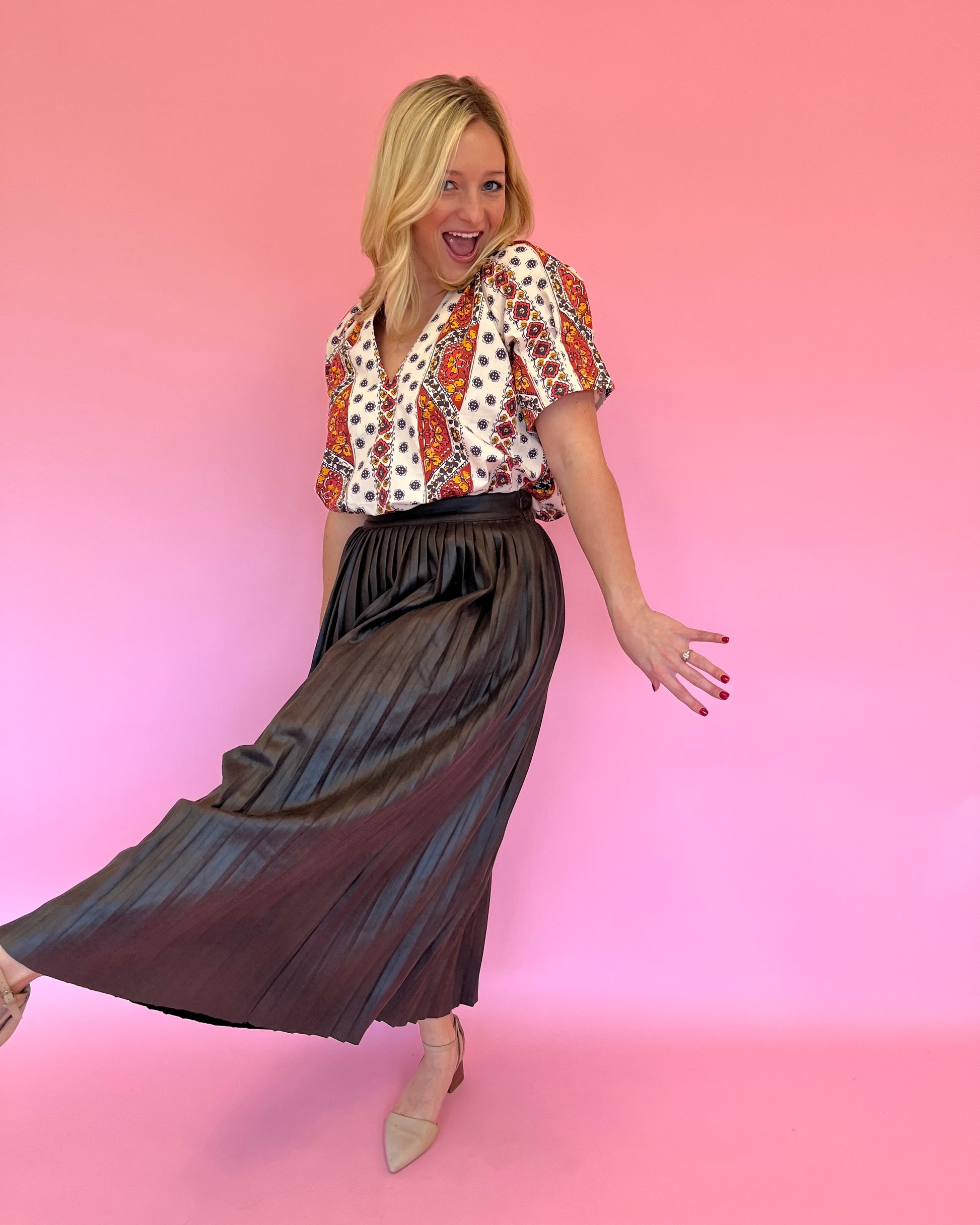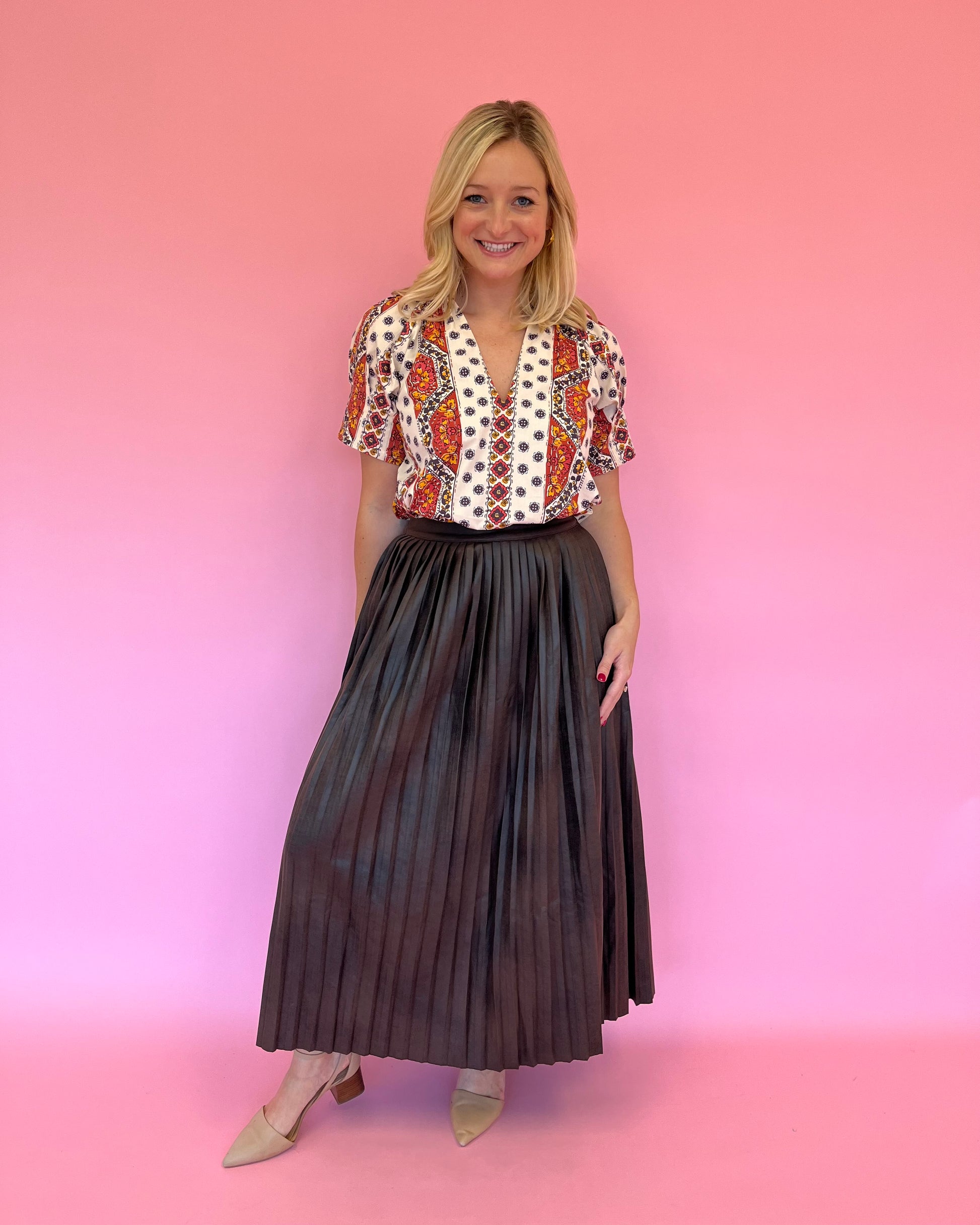 The Lorelai Chocolate Skirt is the ultimate statement piece for chic seasonal style. Designed in a rich chocolate hue with a sleek leather-look finish, this pleated maxi skirt is as flattering as it is versatile. Whether paired with a chunky knit, structured blouse, or tailored jacket, it’s the perfect foundation for fall-to-winter dressing.