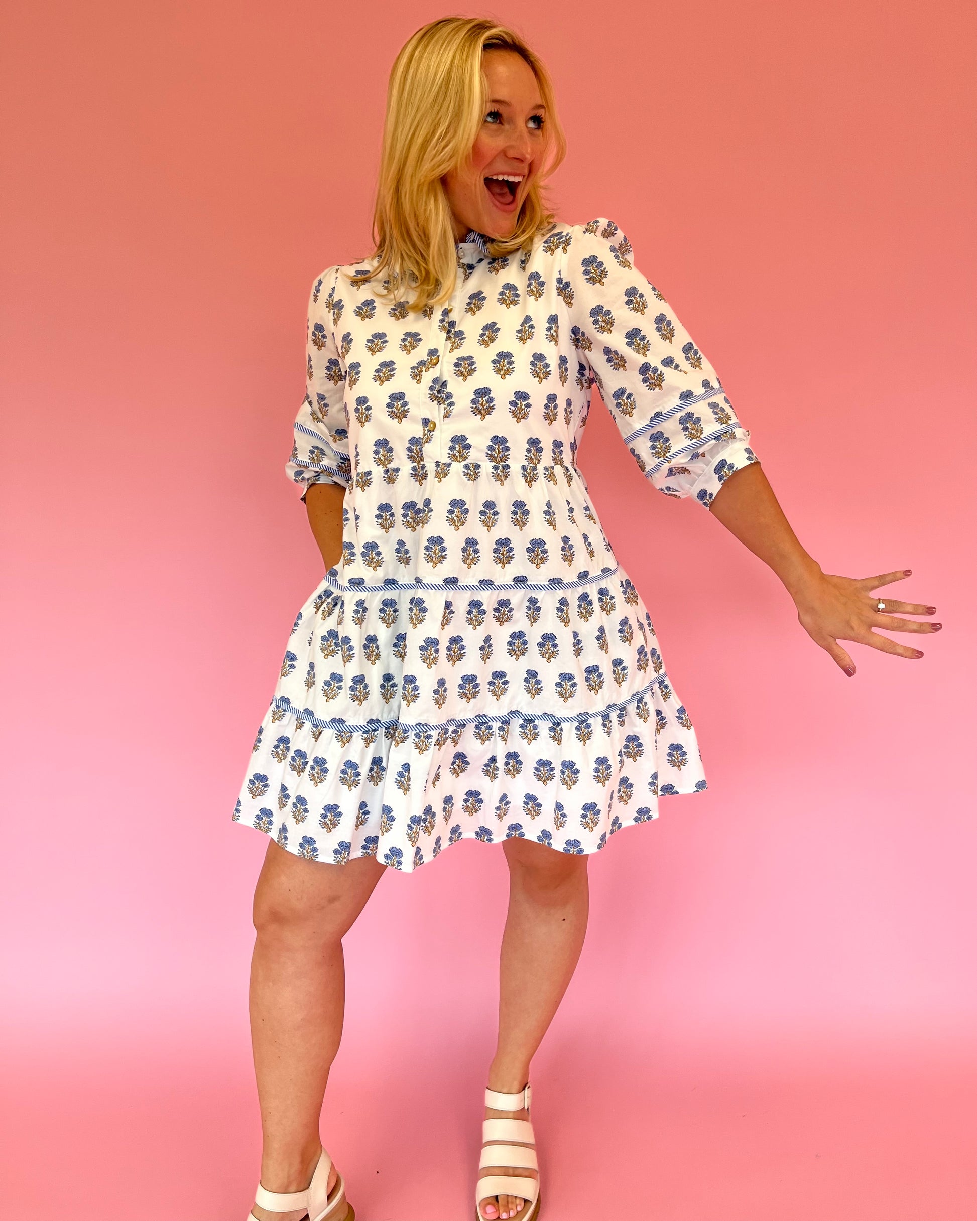 The Mara Block Print Dress is your go-to piece for effortless elegance. Made in a white base with a soft blue and tan block print pattern, this flattering tiered dress features a 3/4 sleeve, button-front detail, and classic collar. Its flowy, tiered style offers comfort without sacrificing charm—perfect for day-to-night styling across seasons.