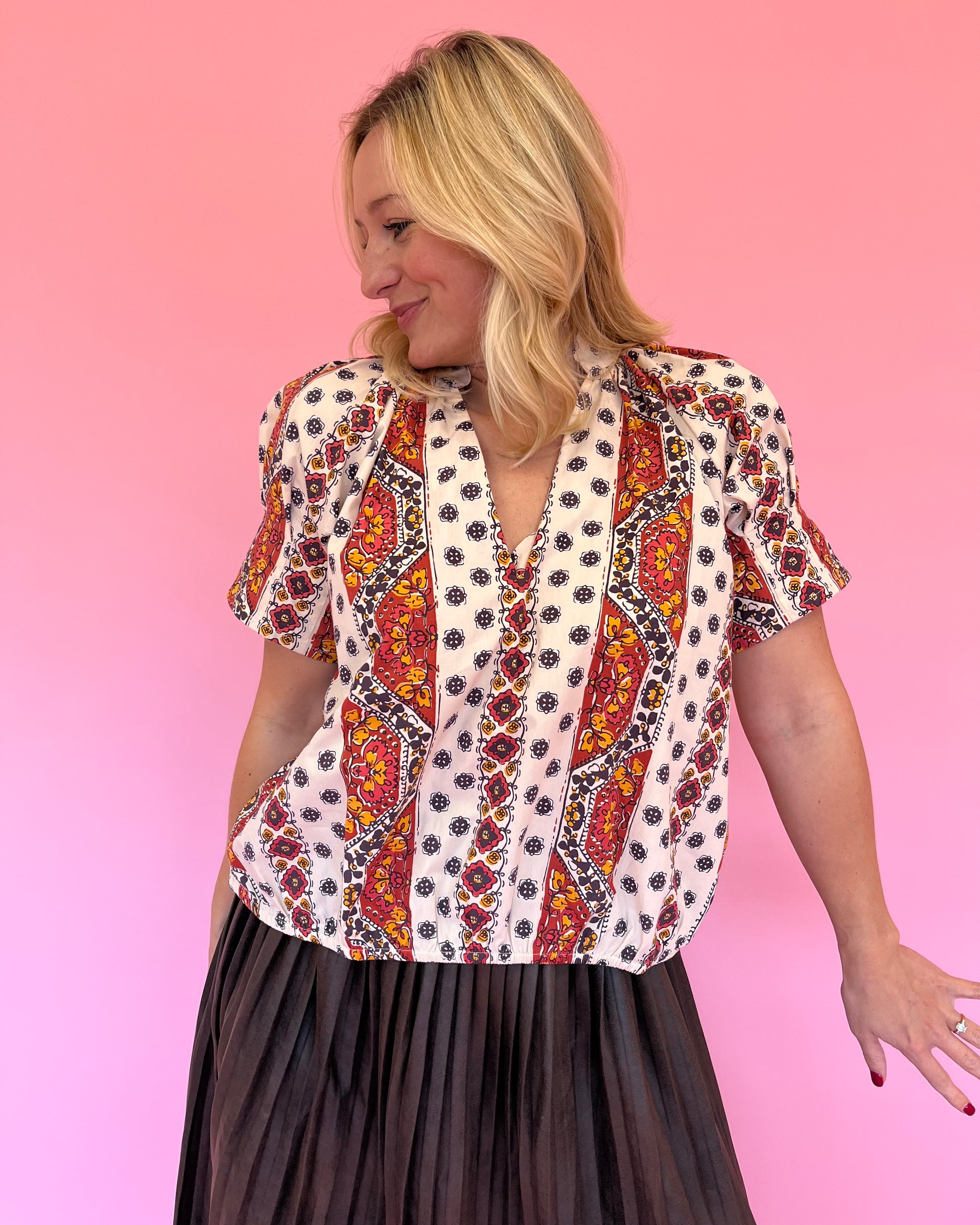 The Merritt Crimson Mosaic Top is a warm-toned wardrobe standout, perfect for transitioning through the seasons. Designed in breathable cotton with a classic v-neckline and a flattering, slightly boxy silhouette, it’s easy to wear tucked in or out thanks to the comfy elastic hem. Its rich mosaic pattern brings a timeless pop of color, making it a versatile piece for both casual days and elevated outings.