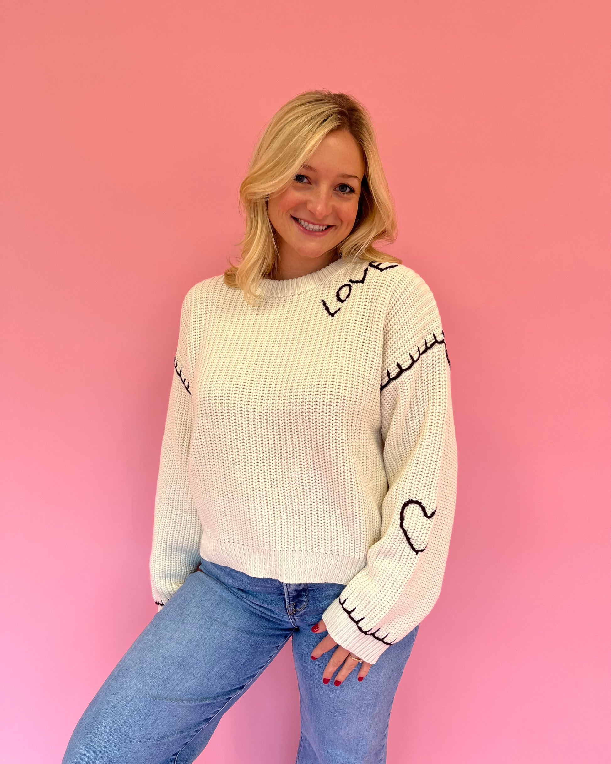 The Mya Love Knit Sweater is the perfect blend of comfort and charm. This soft ivory knit features an oversized fit for a relaxed, effortless look, while “love” embroidered at the neckline and a heart accent on the left elbow add the cutest playful detail. Finished with overstitch hem detailing, it’s easy to dress up or down — a feel‑good favorite for every season!