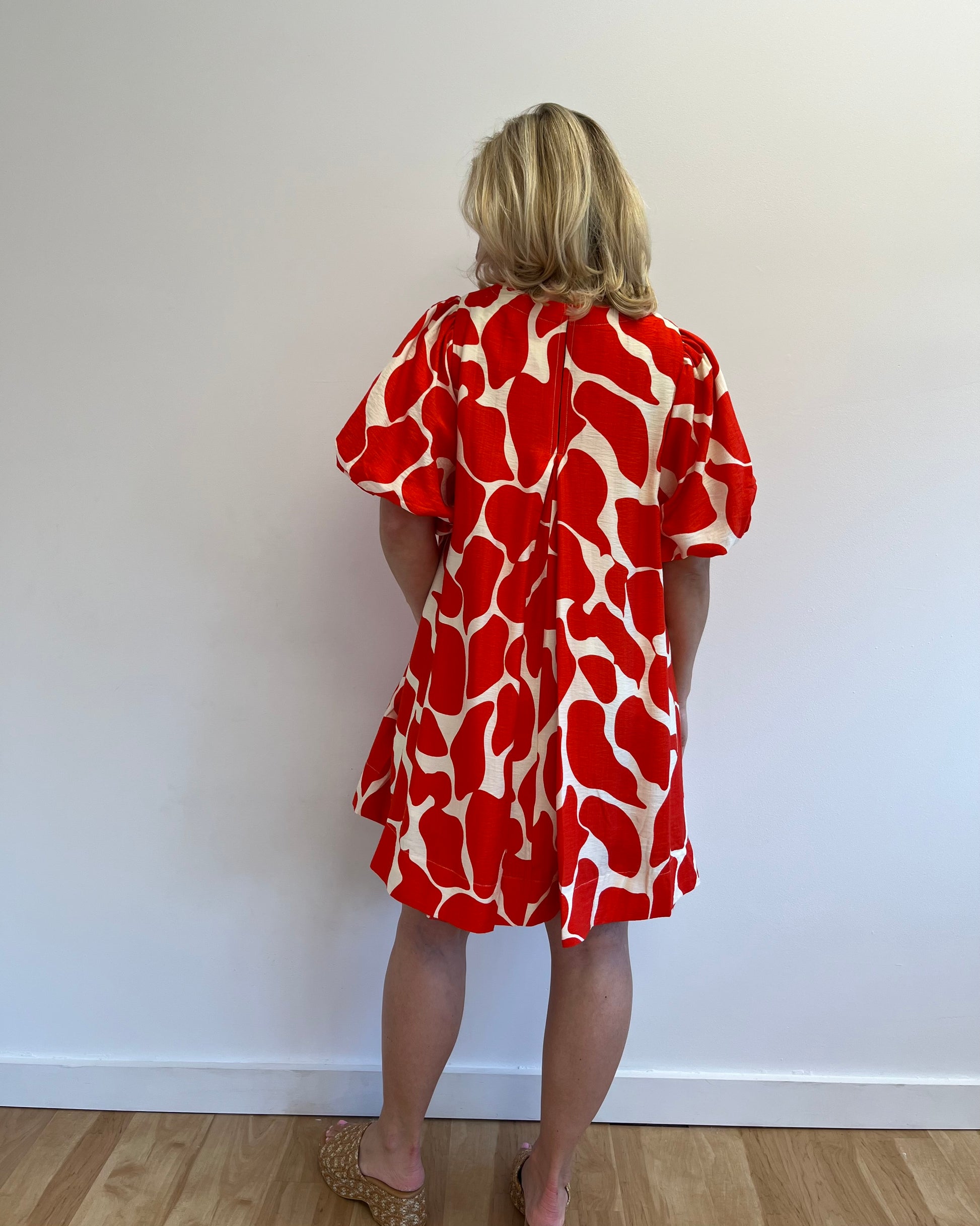 The Sarah Red Abstract Dress is bold, breezy, and perfect for those in-between season days. Featuring a striking red abstract pattern, this flattering A-line dress is designed with puff sleeves, a flowy silhouette, and convenient pockets. The fit is both polished and comfortable — ideal for dressing up or down with ease.